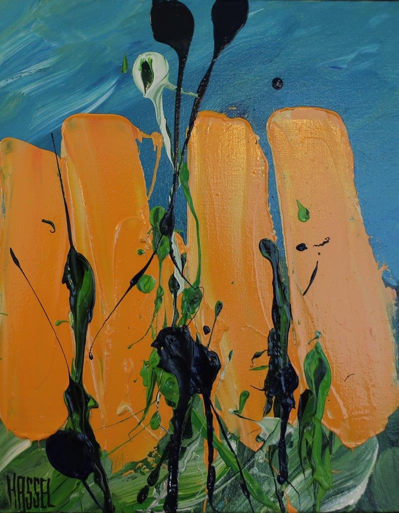 De bekende vrolijke tulpen van Ad van Hassel. Kleiner werk, mooi ingelijst. Leuk, een paar naast elkaar!