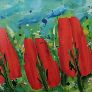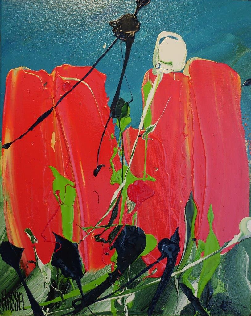 De bekende vrolijke tulpen van Ad van Hassel. Kleiner werk, mooi ingelijst. Leuk, een paar naast elkaar!