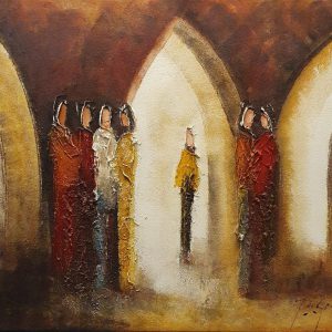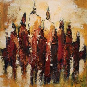 Intens werk van kunstenaar Jochem de Graaf voorstellende een samenzijn van 6 personen / silhouetten.
