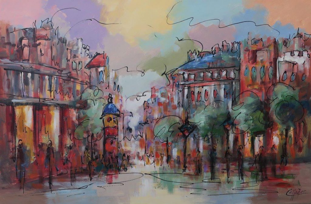 Vrolijk en aansprekend en toegankelijk. Meestal schilder Caspar van Houten kippen of koeien, Deze keer een stadsgezicht van Caspar van Houten.