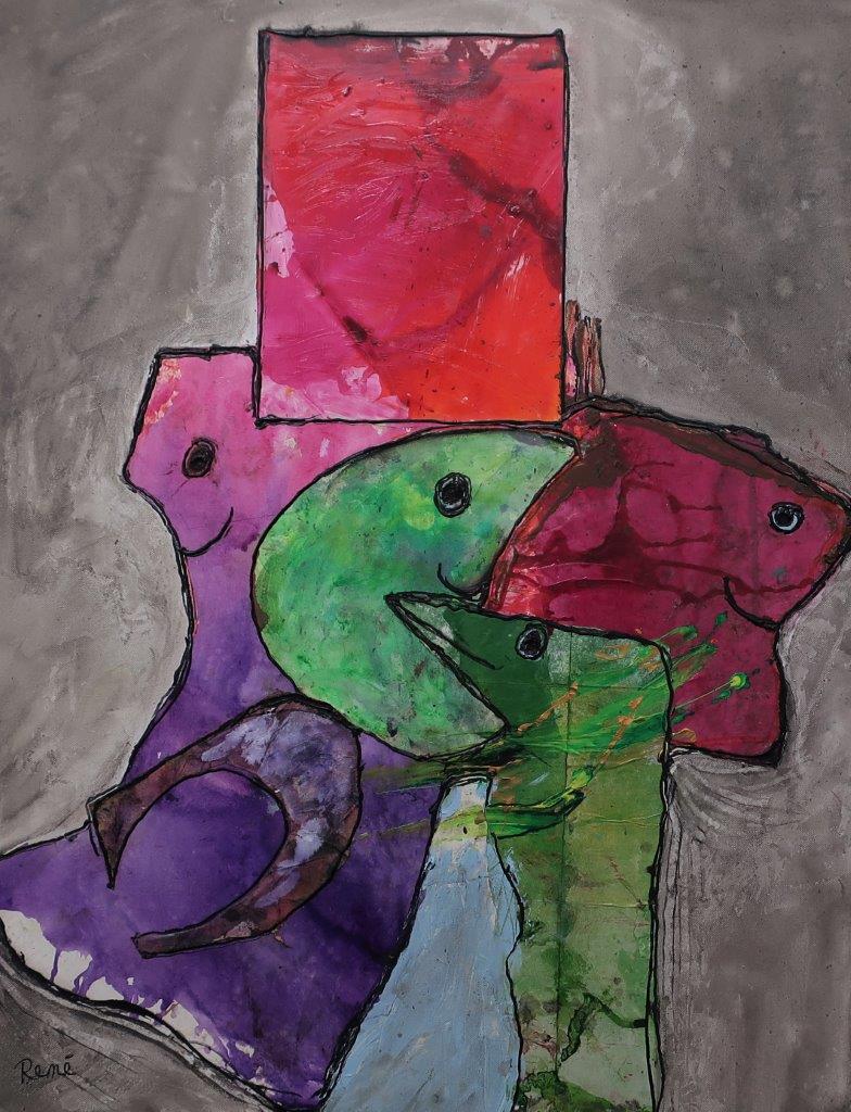 Van onze post-cobra kunstenaar, René van der Meulen, die als schilder bekend is geworden met zijn ‘aardappelhoofdjes’. Deze is bijzonder vanwege de interessant rode rechthoek.
